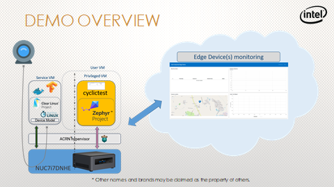 In this demo, the ACRN hypervisor runs 2 virtual machines: a real-time VM (Zephyr RTOS) and a standard VM (Clear Linux). Artificial Intelligence (Tensor Flow) is used to provide object detection on a video stream. Zephyr runs on the same HW platform but in a privileged mode to ensure its real-time characteristics are preserved. A real-time benchmark is running inside Zephyr to demonstrate the real-time behavior of the system. A cloud device offers a user-friendly dashboard to see what is happening on the edge device, including visualizing the real-time benchmark (cyclic test) data.