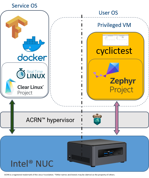 At Embedded World 2019, we demonstrated the Zephyr RTOS running in an ACRN Virtual Machine (VM) in a real-time configuration, while concurrently showing a Clear Linux VM running an Artificial Intelligence (AI) object detection algorithm.